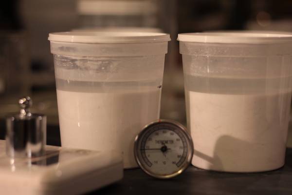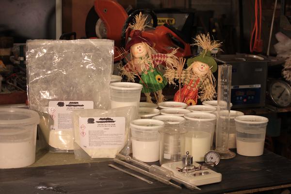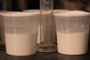 Que les échantillons soient éteints dans un volume d’eau de 3 ou 5 fois le poids de chaux-vive n’a pas d’influence sur le volume de pâte obtenue. Tout au plus sur la température et les risques de débordements. Il est donc préférable de faire l’extinction dans un excès d’eau quitte à l’évacuer par la suite. Le risque de « noyage » de la chaux évoqué dans d’anciens textes ne vaut que si l’utilisation de la pâte est à faire rapidement et que ceci ne permet pas à la pâte de décanter un peu.