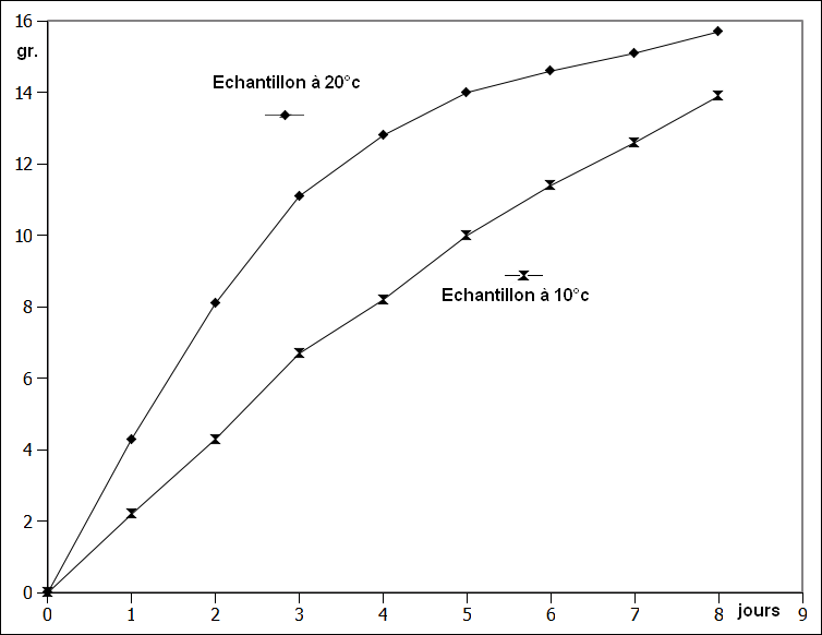 A 10°C l’augmentation est au début de 4% et va se stabiliser un peu au dessus de 0,6% pour tous les échantillons après une dizaine de jours.