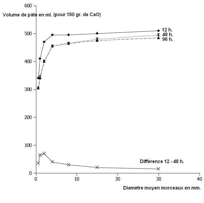 – Ceci pourrait au moins expliquer les valeurs anciennes de 3,5 l/kg, en effet à l’époque la chaux vive sortie du four l’était sous forme de cailloux de bonnes dimensions et si possible éteinte rapidement.