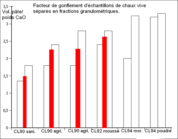 L’explication rationnelle de ce phénomène reste la suivante ; l’indice de pureté de la chaux vive normalisé sous le code NF EN 459-1 n’est pas celui du contenu exact et réel en chaux vive (CaO) du produit. Divers essais en reportent la preuve (voir infra). Une partie de l’échantillon est déjà sous forme de Ca(OH)2 par hydratation à l’air lors du processus de fabrication-ensachage-stockage-distribution. Sachant que lorsque les morceaux de chaux vive s’hydratent ils se désagrègent (voir photo 6) en poudre plus ou moins fine il est alors normal de constater dans un échantillon hétérogène (morceaux + poudre) un gonflement moindre des fractions fines car celles ci renferment la majeure partie de la chaux vive déjà hydratée (voire même carbonatée, voir infra)
